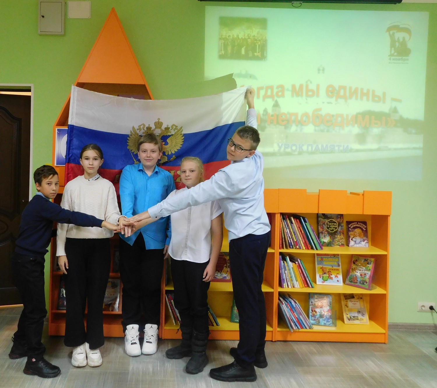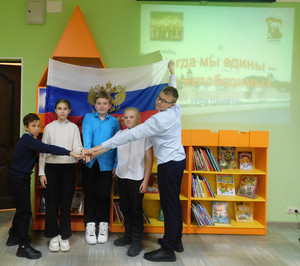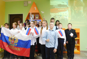 Ко Дню народного единства сотрудники детской библиотеки провели урок памяти «Когда мы едины – мы непобедимы». Библиотекарь рассказала об истории установления праздника, представила информацию о событиях 1612 года, истоках Смуты, о том, как народное ополчение во главе с Д. Пожарским и К. Мининым добилось освобождения столицы от иноземцев. Ребята с удовольствием приняли участие в игровой викторине по типу «Своя игра»: вспоминали события Смутного времени и освобождения Москвы от польских захватчиков, отвечали на вопросы, связанные со знаменитыми полководцами России, вспоминали события Великой Отечественной войны. Участники мероприятия пришли к выводу, что сегодня, как никогда, мы должны стремиться к единству народов многонациональной России, потому что единство и сплоченность – это великая сила. | |