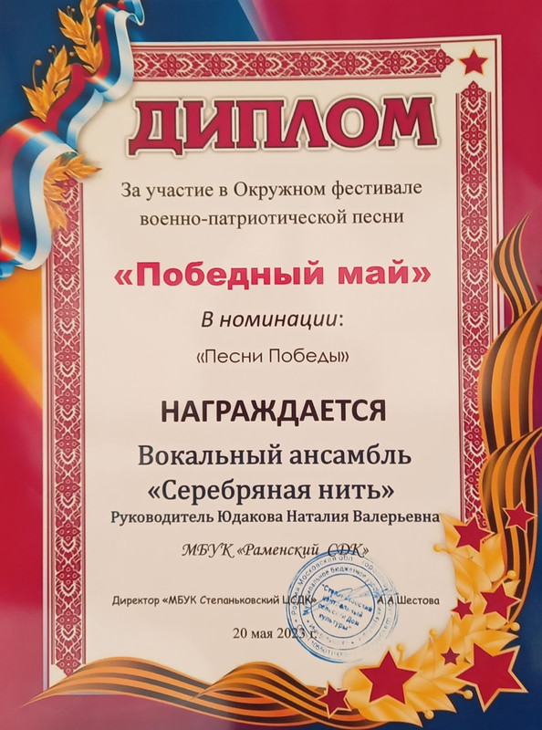 20 мая заведующая Раменской сельской библиотеки Ермакова И.В., режиссер Раменского ДК Гололобова И.Б. и музыкальный руководитель Раменского ДОУ Юдакова Н.В., в составе коллектива "Серебряная нить" (руководитель Юдакова Н.В.) приняли участие в Окружном фестивале военно-патриотической песни "Победный май" в номинации "Песни Победы". | |